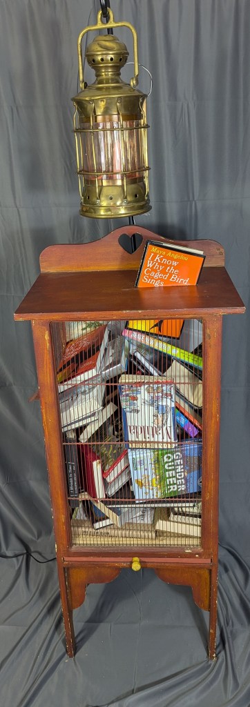 In “Language Lost”, the birdcage becomes a metaphor for imprisoning a free creature and limiting its movement, much like book banning can limit a mind’s explorations. The birdcage is filled with books banned over the last century. Some reasons are for acts of racism, diverse sexuality, family situations, or satanism. Whatever the reason, these books reflect our world, culture and attitudes.