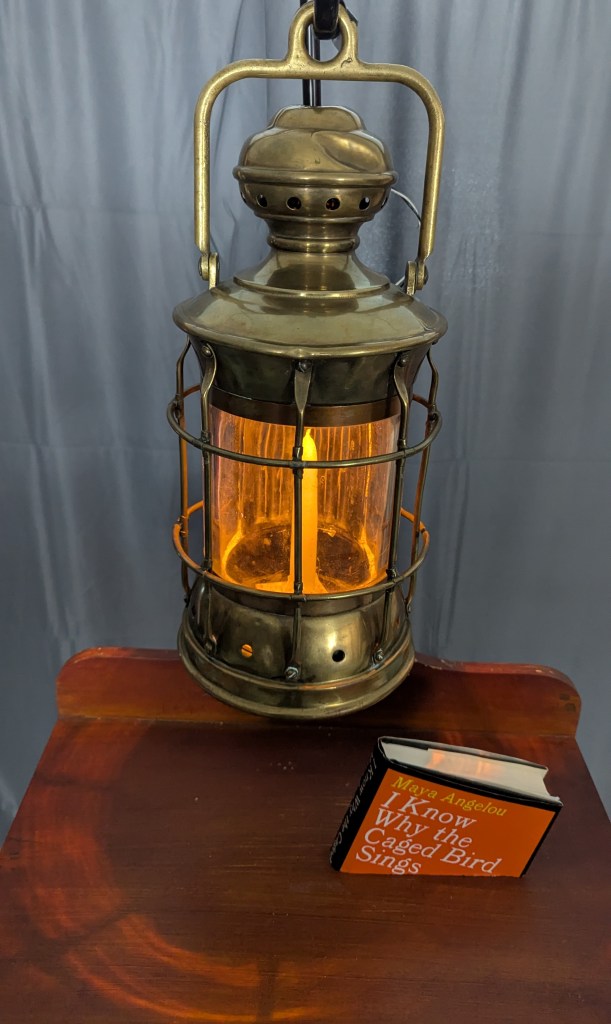 The hurricane lamp hanging above the birdcage, a flicking light at times glows bright to give light in a storm. Other times, its low glow sometimes fades to complete darkness. The lamp shows how without the freedom of expression, the light of knowledge and freedom can grow dim.