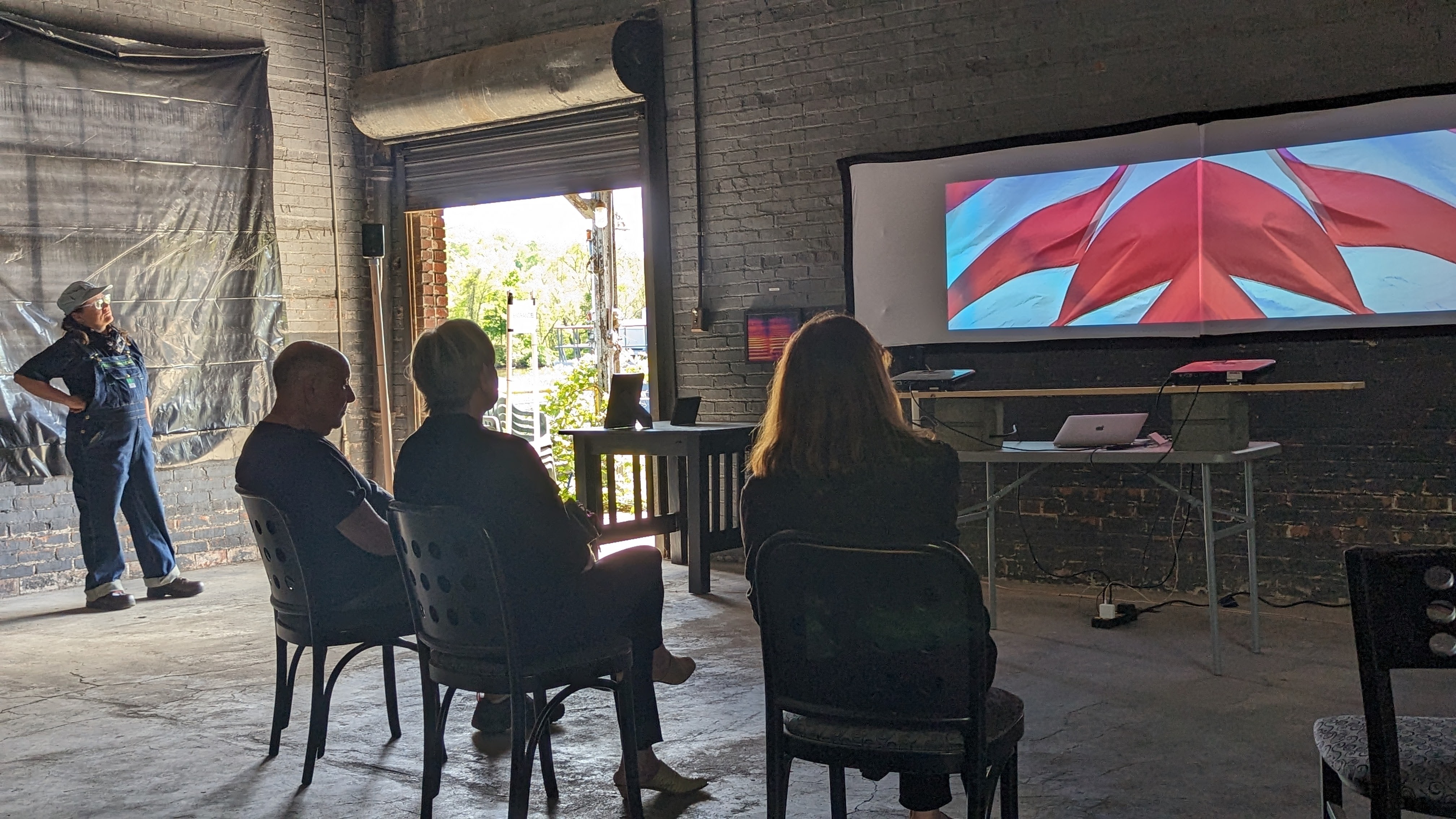 One video is projected by two projectors side by side with one of the images being projected as a mirror image. With one exception, the video material gives no reference as to right or left. Which is the real image and which is false? The video image is surrounded by sixteen speakers.