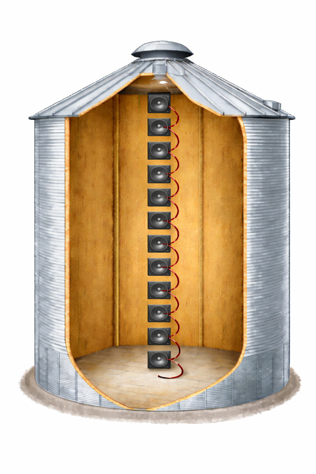 16 computer-controlled sound distribution system speakers installed from the top of the silo down to the floor. Exploring the acoustic properties of the silo with ascending and descending Shepard tones.